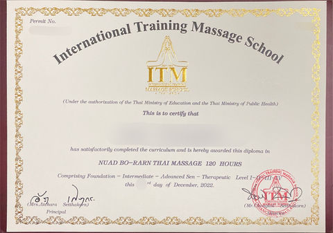 タイ古式マッサージのコースでは、タイ北部にあるチェンマイの「タイ政府認定校ITM」の修了証(ディプロマ)取得が可能です。当スクール講師はITM公認の上級講師ですので、チェンマイのITM本校へ編入したい方へのサポートもさせていただきます。※ITM(インターナショナル トレーニング マッサージスクール)