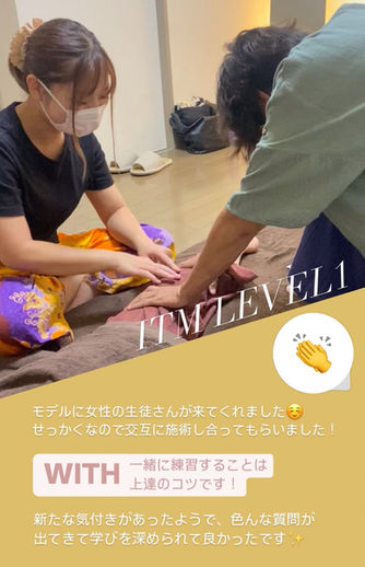 タイ古式マッサージのコースでは、タイ北部にあるチェンマイの「タイ政府認定校ITM」の修了証(ディプロマ)取得が可能です。当スクール講師はITM公認の上級講師ですので、チェンマイのITM本校へ編入したい方へのサポートもさせていただきます。※ITM(インターナショナル トレーニング マッサージスクール)